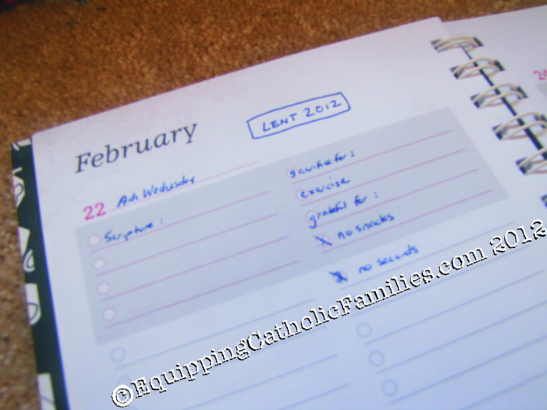 Before Lent started this year, I was already trying something new. I picked up a spiral-bound daytimer calendar at the dollar store. I like it because there are only about 2 days per page, with lines to write on and even little check-circles to check. The calendar is not specific to any year…it has the months and the dates, but not the day of the week. I’m using it to keep track of how I meet my goals each day: