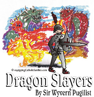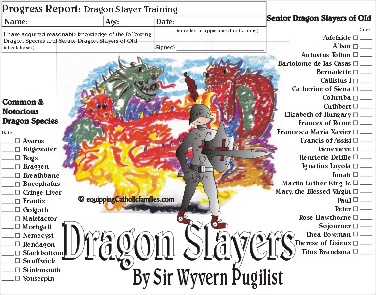 I just love this book!  Dragon Slayers is an imaginative and inspiring book to help train 8-12 year olds in the virtuous task of Dragon Slaying! Sir Wyvern Pugilist instructs with humor and diligence how to identify sins and vices in the form of dragons, learn tactics to withstand their attacks through Scripture and the proper use of the Armor of God.  He also introduces our ultimate mentors:  the Dragon Slayers of Old (the Saints) and the Chief Dragon Slayer Himself (Jesus). It is such a creative book, complete with an enrollment certificate, profiles of successful Dragon Slayers and the dragons and helpful advice and encouragement along the way.