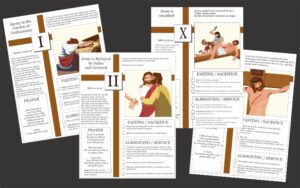 This Catholic Craft Kit includes 14 full-page illustrated Way of the Cross Stations with Fasting, Almsgiving and Prayer Challenges, to cycle through the hours of Ash Wednesday or Good Friday, OR to cycle through each day of Lent. Pope John Paul II presented the Way of the Cross Devotion in 1991, combining the classic Stations of the Cross with the Sorrowful Mysteries. The 14 Scripture-based events begin with the Agony in the Garden and finish with Jesus’s Body placed in the Tomb.