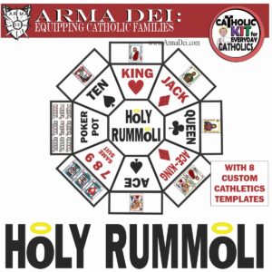 Holy Rummoli can be played with Cathletics (or a regular playing card deck) and a set of Poker Chips or Bingo tokens (not included).