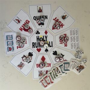 The Holy Rummoli craft kit includes the 9 classic Card and Combo spaces, along with 8 additional custom Cathletics Card and Combo spaces, arranged to create the table-top Rummoli game.