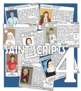 If you have purchased Saint Scripts ONE, TWO or THREE Craft Kit printables from us before, you’ll know that each Craft Kit includes full color postcards of 20+ Saints, along with half-page black and white templates with the illustrated saint to color and a layout for the facts!